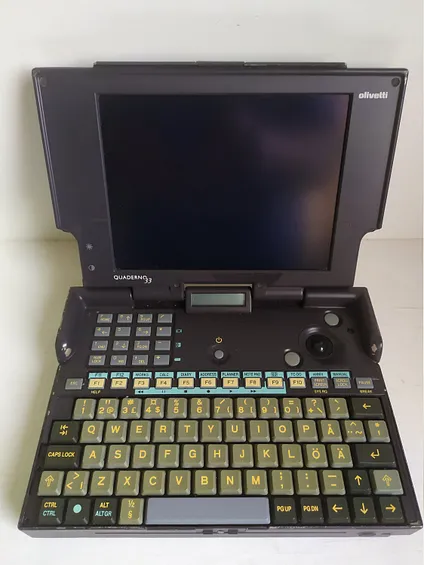 To overcome the deficiencies of the prior model, Olivetti quickly released the Quaderno 33 (PT-AT-60). This machine utilized a 20MHz AMD 386SXLV, 4MB of RAM, a 60MB HDD, and a backlit, seven inch LCD capable of sixteen gray levels at 640 by 480. This model further featured Windows 3.1, Microsoft Works, and Lotus Organizer. The AAs were gone and power came from nickel-cadmium cells. Combined with power management features, this little laptop could manage six hours of operation per charge.