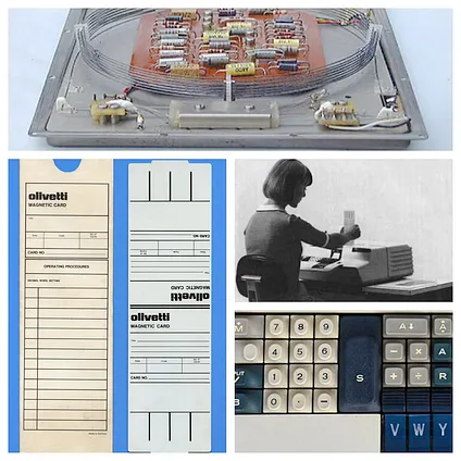 Faggin’s small computer was refined and adapted by Pier Perotto, Giovanni De Sandre, Gastone Garziera, and Giancarlo Toppi. It became a diminutive, simple, programmable, personal, desktop computer. Given the time, the entire system was built of discrete components: transistors, diodes, resistors, capacitors. For memory, the machine utilized 240 bytes of magnetostrictive, metal-wire, acoustic delay lines with a cycle time of 2.2 milliseconds. All of these components were then mounted on phenolic resin (commonly known as Bakelite) cards. Phenolic resin a was cheap, heat-resistant, nonconductive, synthetic plastic first patented in 1907. It was easy to mold and could be produced quite quickly. The major downsides were swelling under extreme humidity, difficulty in recycling, and toxicity. The material ceased being used with arrival of ABS and PVC.